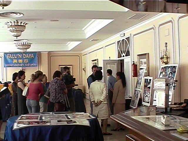 会场周围展出了法轮功的正法历程以及受害者们的图片。记者们非常关切地拍摄下了受害者们以及被毒打致死的学员们的照片。
