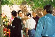 在领馆庆祝活动开始的几十分钟之后,在2点40分左右,突然有一夥人冲到我们面前,一个身着紫红上衣的男子开始做些污辱人的手势,另有几个开始说些不乾不净的话。学员们保持冷静的态度,做到打不还手、骂不还口。后来,一个穿黑色西服的人双手伸向鹿丰的胸部抢材料,如此前后三次,并将资料揉坏。