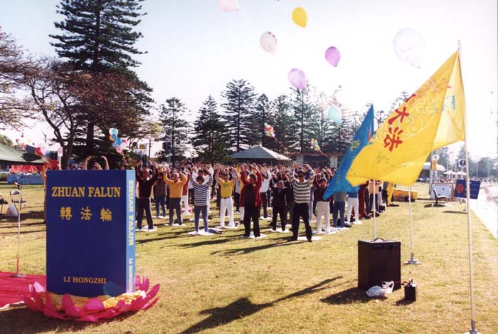 这天,阳光灿烂、风和日丽,湛蓝的海水碧波荡漾。在库克公园大法弟子们在悦耳的炼功音乐声中,缓、慢、圆的展示着功法,祥和、宁静的炼功场面吸引着游人们的关注,有感兴趣者当即便跟着学炼起来。还有不少游人被周围悬挂的“法轮大法”、“真、善、忍”横幅、洪法图片、酷刑真象图片展板所吸引。人们询问后知道了更多真象,主动签名以表支持和关注。