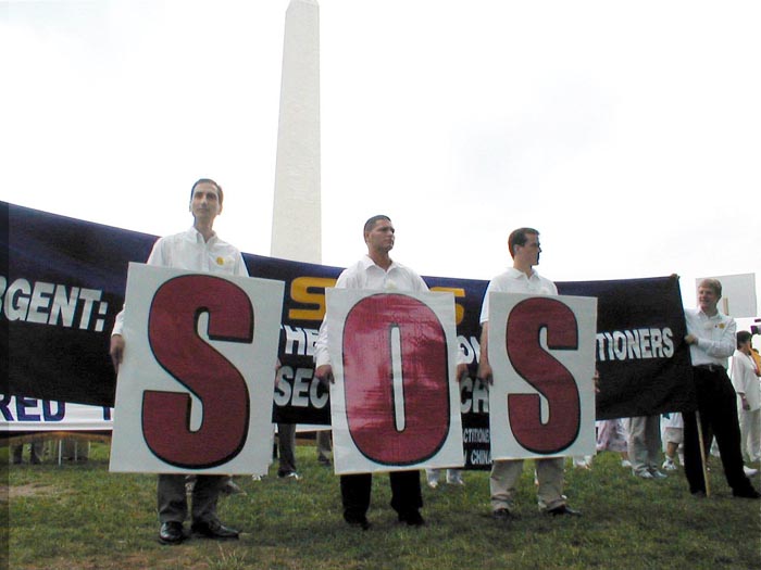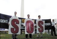 今天上午,阴霾蔽日,大法弟子白衣如雪,站成整齐的方队集体炼功,气氛悲壮而又祥和。各地学员,尤其是DC本地学员,赶做了数百份大型图片,上面印有醒目的三个英文字母“SOS(十万火急)”,几十名功友沿路一字排开,手举让人不忍目睹的大陆学员被残害的图片,照片,向过往的路人控诉江泽民集团残酷血腥的迫害。队伍的尽头是一只巨大的画圈,缀满金银色的花,座在一层粉色的莲花上。画圈的中央是一个由白花组成的一个“念”字,寄托学员们对死难弟子的深切怀念。