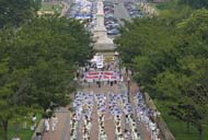 后面是千里跋涉,饱受烈日和风雨洗礼的波士顿学员,他们斜挎着蓝色的绶带,上面写有:Walk to Washington DC(步行前往华盛顿)。身着明黄色法轮功T恤从佛罗里达一路骑车到DC的四名功友手推自行车跟在后面。