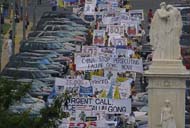 游行的队伍在《普度》悠扬悲壮的音乐声中缓缓前行,马路两旁的居民注视这一群永远是那么安静,祥和而善良的人,人们对酷刑和残酷的镇压表示愤怒,对法轮功学员坚忍不屈的精神表示赞叹钦佩。路旁的一位印度籍美国公民对我说你们真了不起,中国政府该停止这一切残酷的镇压了,他们对自己人民的信仰自由和幸福应该负责任,他说人们在美国为赚钱,为前途地位而忙碌,而你们能放弃自己的很多利益,花时间,花精力,支持你们在国内的同修,你们作了一件极有意义的事情,你们会成功的,我的心跟随你们,支持你们,祝福你们。