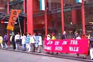 接着我们在市中心走了一个半小时,于大约下午两点钟抵达州议会大厦。参加我们步行的还有“2000年世界和平”地区代表里查德·弗莱彻和墨尔本市政府官员大卫·里斯特。弗莱彻并在州议会大厦前发表讲话,支持法轮大法弟子的人权。另外,“非暴力协会”也发来了一项对法轮大法支持的声明。