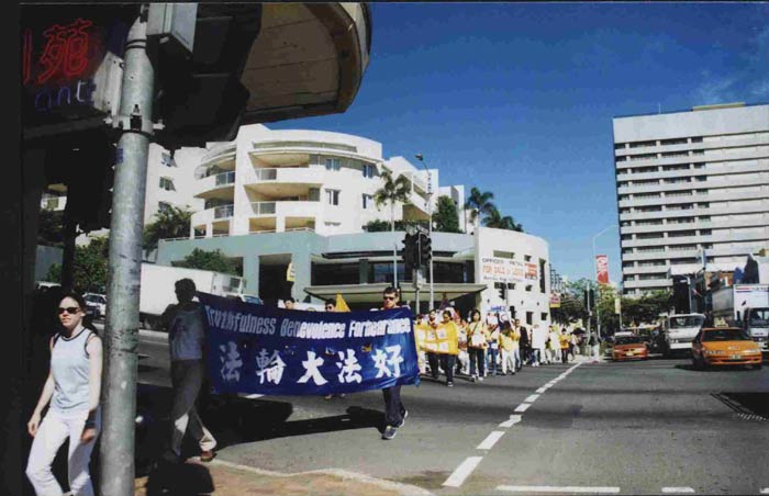 一路上不少行人积极索要资料,纷纷表示同情,许多汽车司机鸣喇叭并友好的招手以示支持。学员所带的"讲真象"资料全部发完。一位西人男青年刚好从商店走出来,马上加入游行队伍并对学员说:"只有独裁者的统治下,才会发生这样的事情"。队伍经过中国旅行团的大轿车,一名先看到的女孩马上告诉所有的人,大家纷纷拍照并流露出同情的目光。