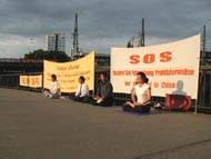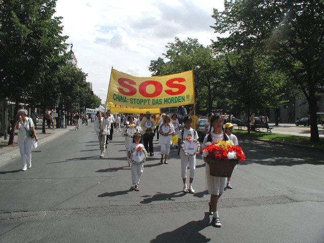 行进中,我们在大街上发报纸,几名同修向大臣贾斯卡·菲思克尔(Joschka Fischer)递交了众多民意签名。当“SOS呼吁紧急救援”游行队伍到中国大使馆时,我们遇到了在那里坚持请愿200小时以上的大法弟子们。大家在一起进行了集体炼功并散发了介绍大法和揭露迫害的传单。