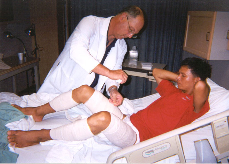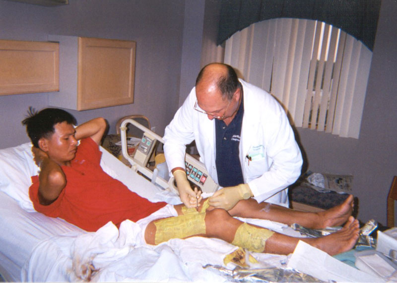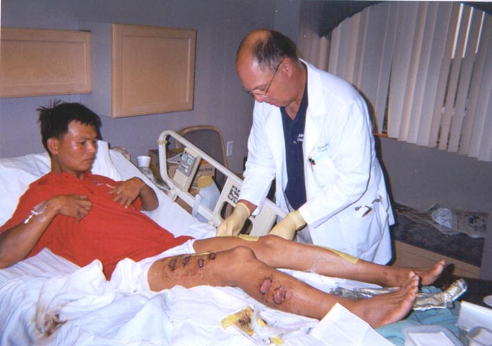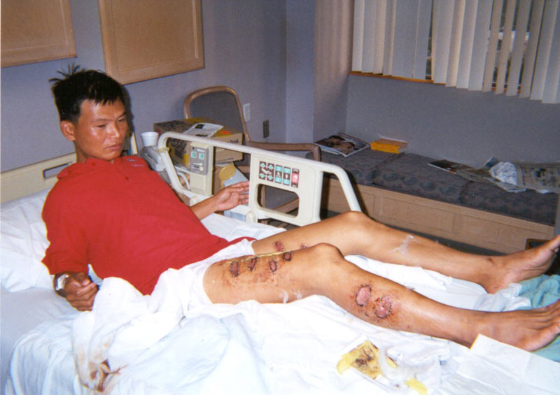 後来,他搭运输车逃到香港,6月10日搭乘一艘集装箱船,在海上飘泊约半个月,经历艰辛,于6月24日到达加州长滩(Long Beach),由于语言不通,四下求助,一位善心的老人开车去佛罗里达带上了他,到达休士顿时他身无分文,求助当地警察,警察帮他送到“希望之星”救济站。7月13日,他烙伤伤口冲澡时破裂,被送进公园广场医院治疗,医生诊断为三级烧伤、共十三处伤口、深入肌肉之中,至今已近两月伤口看上去仍然惨不忍睹,因伤口面积过大、过深,难以愈合,医生为他作了植皮手术,预计他很快就能出院。