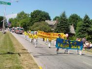 伴随动人的普渡济世音乐,在灿烂的阳光下,彩车开路,我们的游行开始了。虽然我们的前后队伍都有高音喇叭鸣叫,却吸引了观众对我们祥和队伍的注意。由于我们在游行前已散发大量真象传单,当一些观众看到“法轮大法”,“真,善,忍”的横幅时,使劲鼓掌,有的还翘起大拇指。面带微笑,我们向人们招手,衷心祝福小城知道大法真象的善良人们。