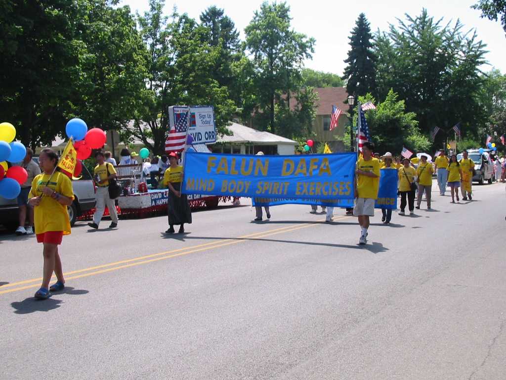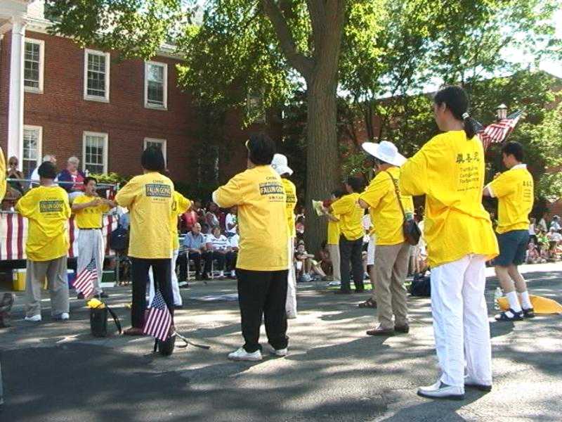 游行是从下午2点开始,不过学员已提前几个小时到了,为的是在游行前把真相传单发给更多的人。在游行队伍中规定不能发材料,但可以在路边发。几位学员专门从游行中抽出来发材料,几里路的游行路线上,这几位学员几乎没停止向热情的观众散发。无法计算发出去多少真相传单!学员们没有豪华的游行彩车,只有简单的几个横幅标语;没有喧闹的队伍,只有黄T恤加上整齐祥和而又庄严的队伍;但观众中不时地给予热烈掌声,竖起大拇指表示他们的敬意和支持。有的观众告诉学员,他们看到了有关法轮功的新闻报导,对中国江泽民政府的镇压实在不可理解,也非常敬佩法轮功学员的精神,祝法轮功好运!