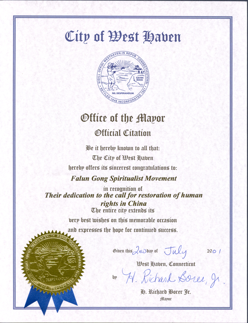 康涅狄格州西海文市市长褒奖法轮功精神运动