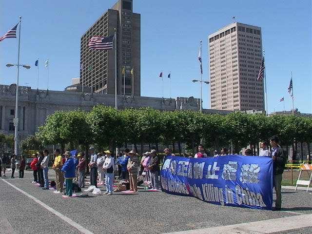 学员们在声明中说:今天我们在这里,将长途跋涉,横跨美国大地,发出紧急呼救的请求,请求你们帮助救援正在遭受迫害和酷刑的中国法轮功学员。