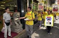 2001年8月10日,星期五,约20名法轮功学员在沿街游行散发传单。法轮功学员游行是为了支持香港居民和法轮功学员刘玉玲(右边者),她的儿子(展牌上的)陈旭涛也是法轮功学员。陈旭涛于2001年7月12日在北京被捕。这是要求释放陈旭涛和呼吁中国政府停止迫害法轮功学员的为期三天活动的最后一日。