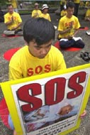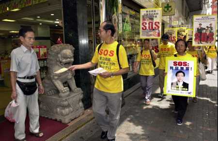 路透社2001年8月10日香港消息,法轮功精神运动的成员于星期五在香港抗议中国(江泽民犯罪集团)关押香港法轮功学员。