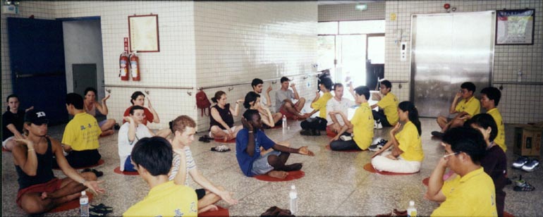 接着我们跟着师父的口令与大法的音乐一同炼功,学员去帮忙纠正动作,那是一个非常祥和的场,其中那位把第五套功法学会的贝南青年也来跟我们一起炼,那位随队翻译也跟我们一起炼。那时在我面前一位西班牙青年闭着眼睛非常专注,但他不懂中文,在炼第三套功法时他不知道已经开始冲灌了,直到我们提醒,他才一脸讶异的出手,随即又闭上眼认真地做,原来他已记住了。但到推转法轮时,因我们没讲清楚推四次,他推了好多次才结印,仍是闭着眼的,好像一个天真的小孩。到第五套功法时,我在最后结印入定后睁眼瞄了一下,只见一个个清新的面孔,闭目静静地在那坐着,包括那位翻译,也跟我们一起坐,还采用双盘。虽然整个炼功过程只短短的不到三十分钟,但望着这群西班牙朋友,心中有个念头:不知是否其中某位将来便是大法的骨干精英?