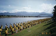 在国外团队方面,第一天因台风取消教功,第二天是对贝南,一个法语体系的非洲国家。他们多是小孩子,因为我们人手多,除了台上的两位负责人,其余几乎是一对一的教,就好比教小朋友班一样。因为语言不通,我们只有靠标准的动作当作唯一沟通的方式。在炼第五套功法时,其中一位青年学的好认真,我们只教一次,他在私底下却炼了好几次,连休息喝水的时间也在复习,动作也记起来了,他真的很喜欢法轮功。后来贝南的团队领导看到我们都叫"Falun Dafa!(法轮大法)",我们也回应"Good!(好!)"。我感到大法已在他们心中扎下了根。