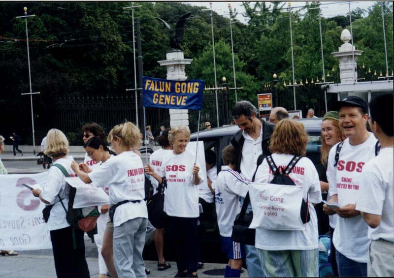 这次活动将持续八天,至23日到达首都伯尔尼联邦政府广场。十六日,从日内瓦出发的有20多名弟子,最年长者71岁,最年幼者2岁(妈妈背着行走)。8岁小弟子艾琳(Ailine)一直坚持走到底。弟子们穿着白色印有“SOS中国:停止虐杀”的T恤衫,打着“SOS紧急救援中国被迫害的法轮功学员”的横幅,伴随着“普度”、“济世”音乐,穿过日内瓦市中心闹市区。几名摄影、摄像文字记者跟随步行队伍采访。当步行队伍抵达中国代表团驻地时,全体弟子齐发正念:“法正乾坤,邪恶全灭”,晚八时,抵达宿营地。晚餐后,弟子们一起学习师父新经文,并再次齐发正念。