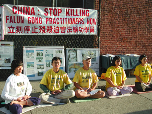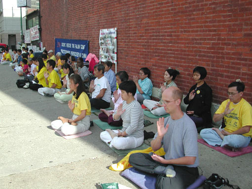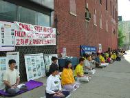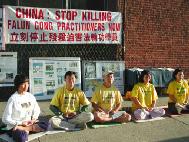 芝加哥法轮功学员林占(山冬)在中领馆前静坐已经进行了好几天,令人振奋的是,八月十七日,有四位St.Louis的法轮功学员听到消息后驱车几百英里来到芝加哥中领馆前,并连续静坐48小时。