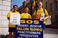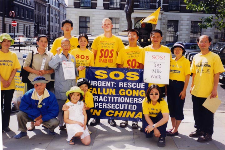 接下来三天,我们都在伦敦的中国大使馆对面炼功、请愿。第一、二天,太阳非常的大,晒得我脸都脱皮了。第二天下午我们正好有幸,遇到三位由爱丁堡走路到伦敦的学员,为中国大法学员向中国大使馆请愿,SOS紧急救援中国大陆被压迫的法轮功学员。那是一段多么遥远的路呀!452英里!相当于从基隆到垦丁路程的两倍。且苏格兰部份山区到曼彻斯特非常偏僻,人烟绝迹,他们身上除了要背帐篷外,还要背锅子跟米,沿途一切须要自己煮饭来吃。两个华人由爱丁堡走起,到了曼彻斯特略微休息的时候,遇到这个才学法轮功三个月的白人,这个白人学员的家人不让他跟随他们俩人去。到了第三天他们俩人要出发的时候,正在刷牙的白人想到,若是失去这次机会,是永远的悔恨,毅然绝然的背起了行囊,三人结伴走到伦敦时,每人脚底都起了水泡。当时他告诉证通说,我看过你写的英译本心得中行脚时起的水泡,你应该很能体会我现在的心情。当我见到他们时,眼眶顿时红了,因为我再度看到自己的不足,只不过在太阳底下炼炼功而已,就累得哇哇叫。