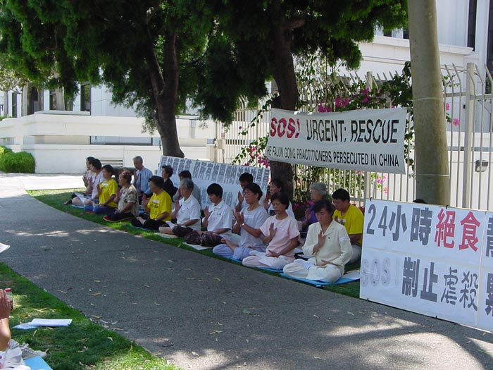 【明慧网2001年8月21日】2001年8月20日中午12点,18位来自洛杉矶、圣地亚哥、和拉斯维加斯的大法弟子在中国驻洛杉矶总领事馆前开始了为期24小时的绝食请愿,声援在辽宁马三家劳教所绝食抗议超期非法关押的130位同修,呼吁中国政府立即释放被非法关押在马三家、万家、长林子等劳教所的法轮功学员,制止江泽民滥用职权、盗用政府名义非法发动的对法轮功的大规模政治