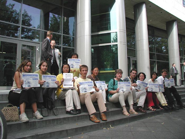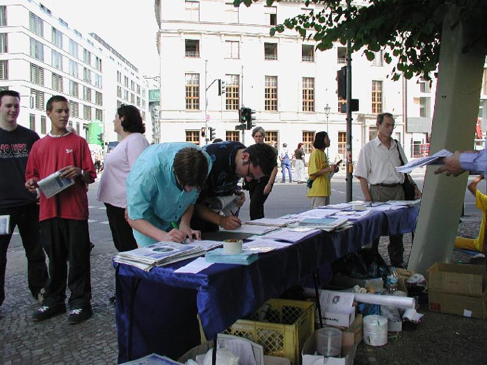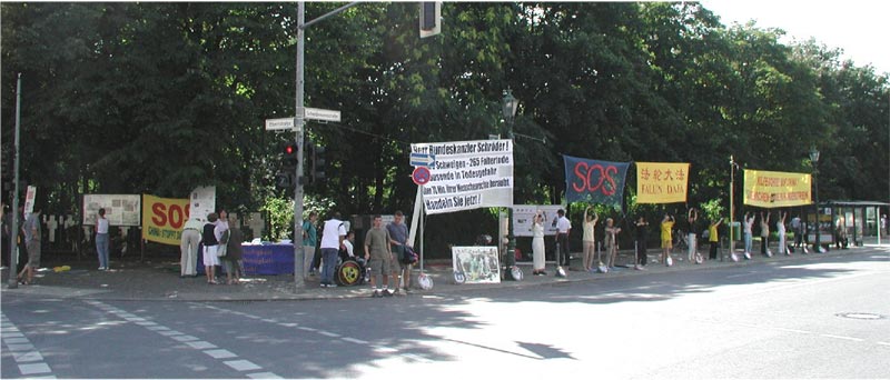 那天,学员们一早就挂好了大横幅“SOS”,“法轮大法”,“紧急救援,刻不容缓”及各种呼吁停止屠杀的横幅。其中的一副引起众多的行人注目:“施莱德总理:已经沉默两年了,268人已死,7百万人被镇压,请立即采取措施!”帝国大厦参观的游人络绎不绝。看到学员紧急呼吁的情景与和平炼功场面,纷纷拍照,索要资料。他们对江政府的暴力行径感到十分震惊,并在向德国总理呼吁书上签字。