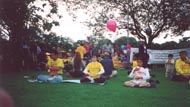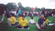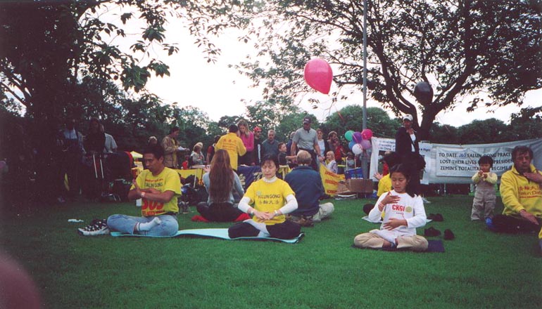 大法弟子在“爱丁堡艺术节”的表演场地之一的“草坪公园”(Meadow Park)洪法。