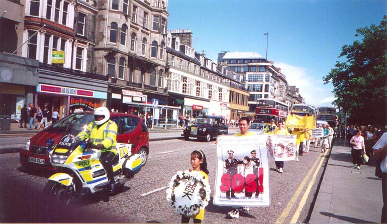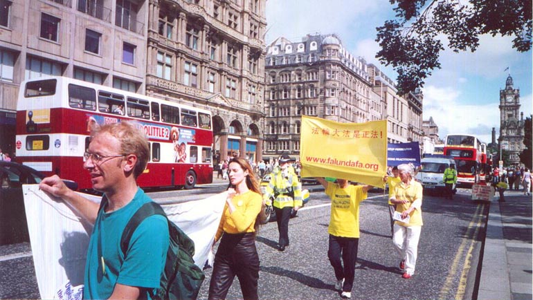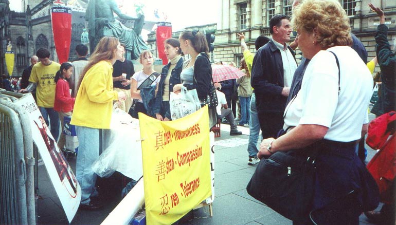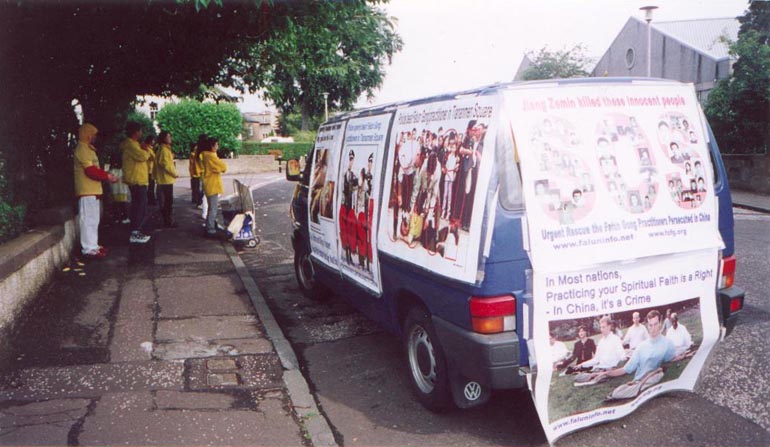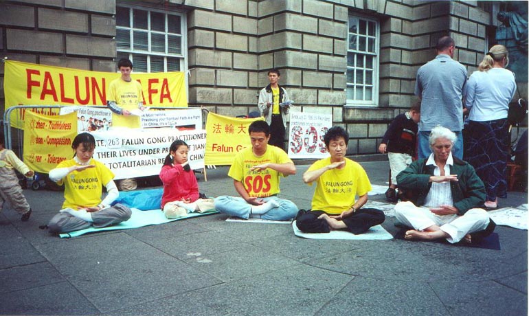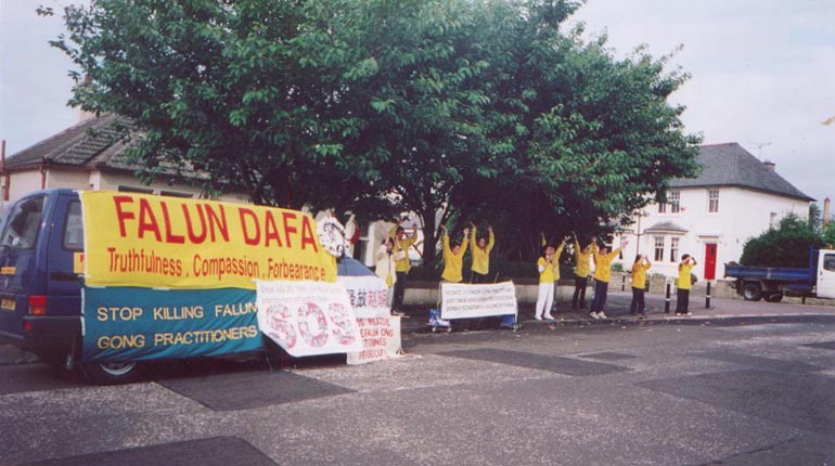 大法弟子在爱丁堡中国领事馆前炼功和平请愿。
