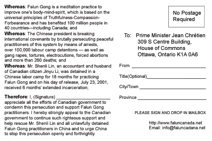 【明慧网2001年8月24日】随着全球“SOS”紧急援救行动的在多个国家的日益深入进行,加拿大大法弟子也采用各种方式向社会各界全面深入讲清真相。结合着“SOS”紧急援救行动以及加拿大的具体情况,加拿大大法弟子设计印刷了一种致加拿大总理的SOS紧急呼吁明信片。明信片正面是李进宇及先生林慎立的照片以及天安门警察在光天化日之下打人和学员受迫害的图片,背面是致加拿大总理的SOS紧急呼吁信。信中重申了法轮功是一种基于真善忍的身心修炼,使遍及40余个国家的上亿人身心受益。然而自1999年7月以来,中国国家主席江泽民开始了对影响千家万户的法轮大法的邪恶迫害;到目前为止,至少有260人被迫害致死,上万人被非法劳教。指出加拿大公民李进宇的先生林慎立在中国因为支持法轮功未经审讯便入狱,关押在上海附近的一个劳改营已超过18个月,并于7月23日本应被释放的日子,又被无任何理由地延长了6个月的刑期。呼吁信感谢加拿大政府及官员为支持中国的法轮功学员所作的努力,并强烈呼吁政府继续这样的正义之举,帮助营救林慎立及中国其他所有遭受迫害的法轮功学员,并公开督促中国停止镇压法轮功。