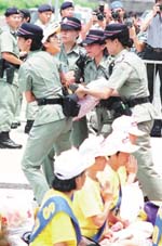【明慧网2001年8月27日】世界日报香港8月26日电,香港法轮功学员在中国大陆驻香港机构「中联办」门口绝食静坐,要求关注在大陆劳教所绝食超过三个星期的法轮功学员。警方下午突然对静坐的法轮功学员采取行动,强制留置警所四个多小时。这是北京镇压法轮功以来,香港警方首次拘捕和平示威的法轮功学员。