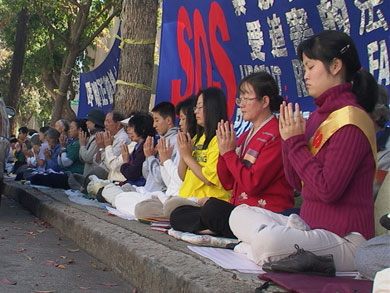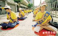 2001年8月24日法轮功追随者在香港政府总部外面进行打坐炼习。大约100名香港法轮功精神运动的学员要求释放被监禁在中国监狱和劳改营的修炼者并要求北京停止对这个团体的迫害。路透社/Kin Cheung