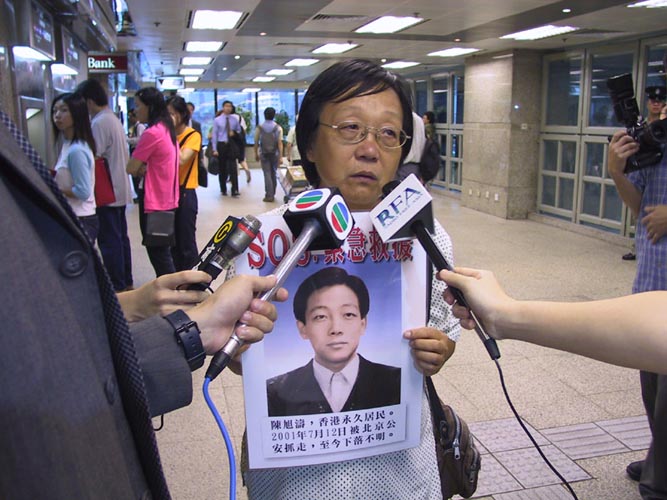 【明慧网2001年8月3日】明报2001年8月2日专讯,一名持香港永久居民身份证的法轮功学员陈旭涛,疑于上月中旬在北京被公安拘押,至今下落不明;其母昨日到入境处求助,要求本港政府协助调查于内地失踪的儿子下落。