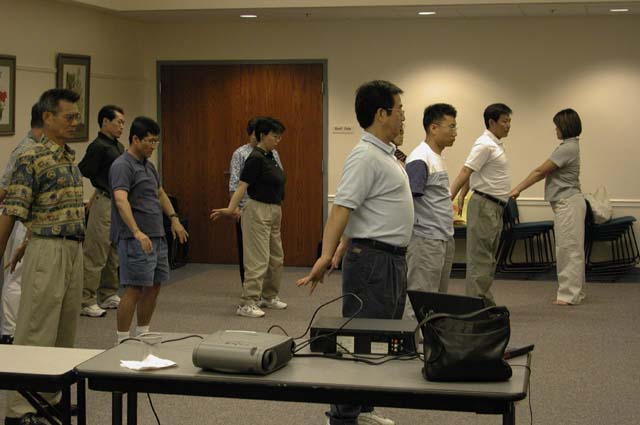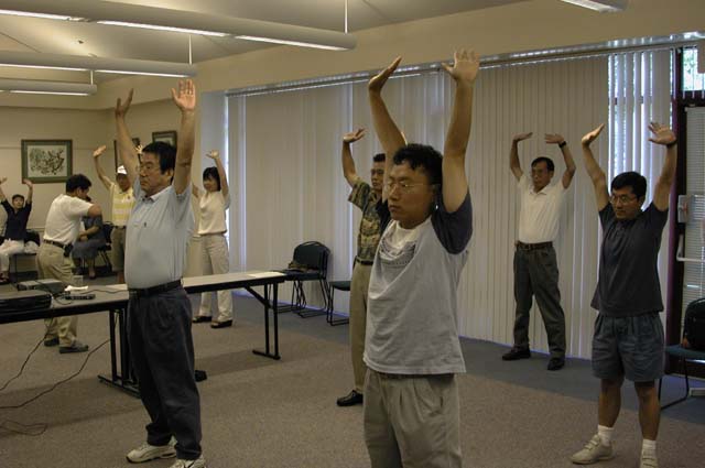 由于时间原因,我们移开部份椅子,只教了第一和第二套功法。有一些人离开了,但大多数人留下来参加炼功。我们一人教功,其他人在周围做个人辅导。在这期间,有一人突然大声并不规则地喘息,她出了问题。于是,一个学员沉着地扶她出去。一会儿,她又回来了,并说刚才的事与法轮功无关。情况还好。这些事是可以预料的,因为一些人是为了治病而来的。当然,我们都会根据法来处理这类问题。