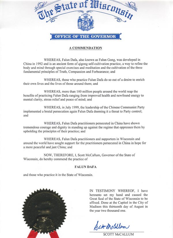 【明慧网2001年8月31日】威斯康星州州长Scott McCallum嘉奖法轮大法和大法学员。