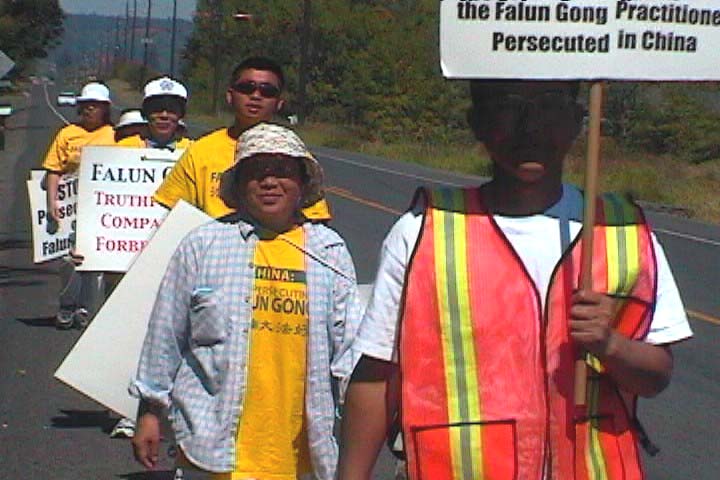 ![]() 烈日炎炎,经受考验,万难无阻。正午不停步,保证日行20英里的计划不能含糊。英文流利的大法弟子一路见人就发资料,再小跑赶上一步不停的队伍。 |