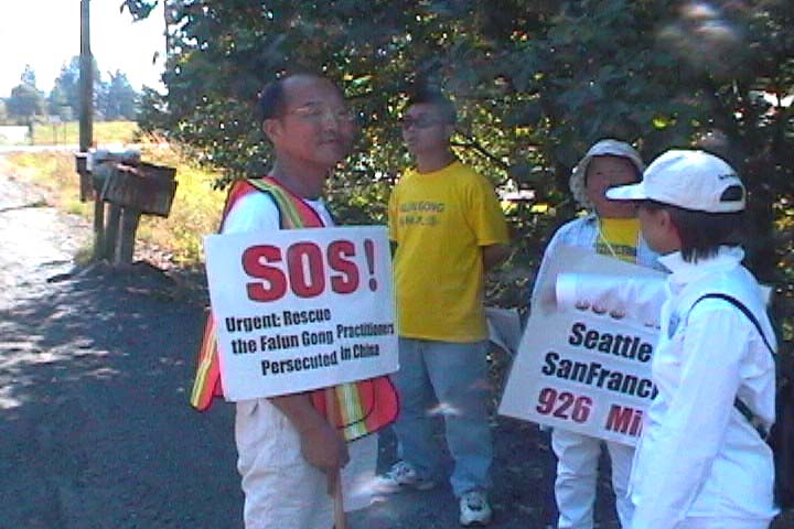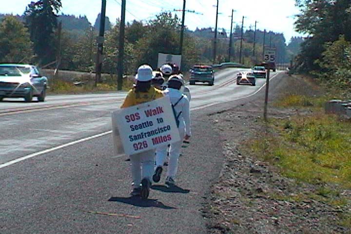 ![]() "SOS Walk Seattle to San Francisco 926 Miles" - SOS紧急救援步行自西雅图到旧金山926英里。前面的看板有“法轮大法 - 真善忍”。一路行车来往,无不目击,讲真相的好办法。 |