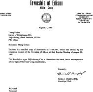 信里是573-082001号决议的公文正副本,于在8月22日的爱迪生市议会上通过。
