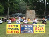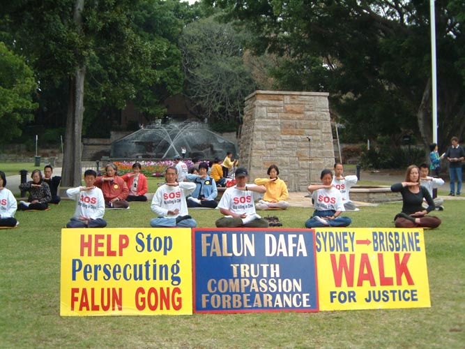 下午1点钟,举行了“SOS紧急救援步行新闻发布会”,在市政厅广场,步行弟子宣读了“SOS紧急救援”步行公开声明:我们这次从悉尼走到布里斯本,是全球性的,如北美、欧洲、亚洲“SOS紧急救援行动”,包括绝食、行走等的一部分,旨在敦促中国江泽民政府立即停止对法轮功修炼者的残酷迫害。在我们离开悉尼的前一天,又有5名女法轮功学员被酷刑迫害致死。自1999年7月至今已有272名法轮功学员死于中国的监狱、劳教所。我们呼吁澳洲政府和人民,共同制止在中国对法轮功学员的镇压和虐杀!