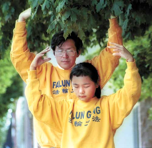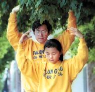 [图]任崔农(音译)和他的女儿丝琳娜(Selena)星期六在扬克顿(Yankton )郡法院外展示了法轮功的功法。任和他的妻子江素在南达科他州(Dakota)东部各地介绍这个可以令人松弛的功法,而该功法已被中国(江泽民)政府禁止。任是南达科他州立大学植物科学的副教授。他全家居住在布鲁金斯(Brookings)。(丹·斯普林格摄)扬克顿新闻(Yankton Press and Dakotan)2001年9月10日刊登文章说,现居住于布鲁金斯的中国移民们星期六来到扬克顿郡推广一种古老的可以解除紧张的炼功系统,并讲述这种看来很庄严的功法如何在他们家乡中国遭到了镇压。