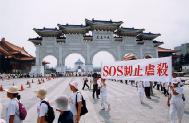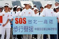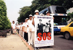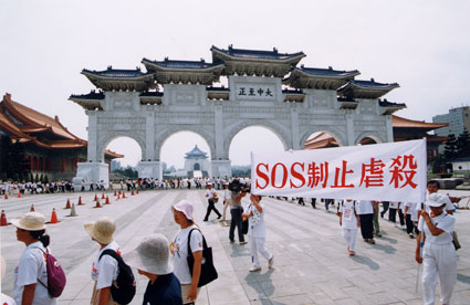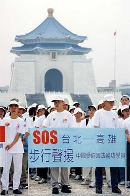 临行前,在台北中正纪念堂举办了一场记者说明会,尽管中共以拒发赴大陆采访证为要胁,阻挠台湾媒体报导任何有关法轮功的活动,但是仍有十数位中外媒体记者到场参加,场边另有约500位台北地区的学员,将于会后一起加入台北市的陪走行程。此时笼罩上空的乌云在残喘地挤下几滴雨之后散去,阳光露了脸,前来参加记者会的贵宾及记者先生小姐们,会后纷纷在我们的征签看板上签名声援;同时,参与步行的学员也开始踏上正法之路。