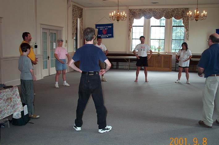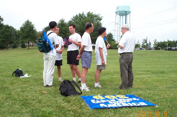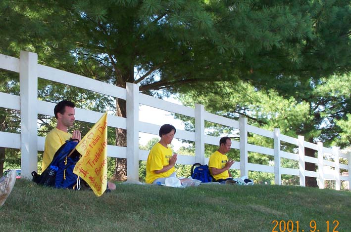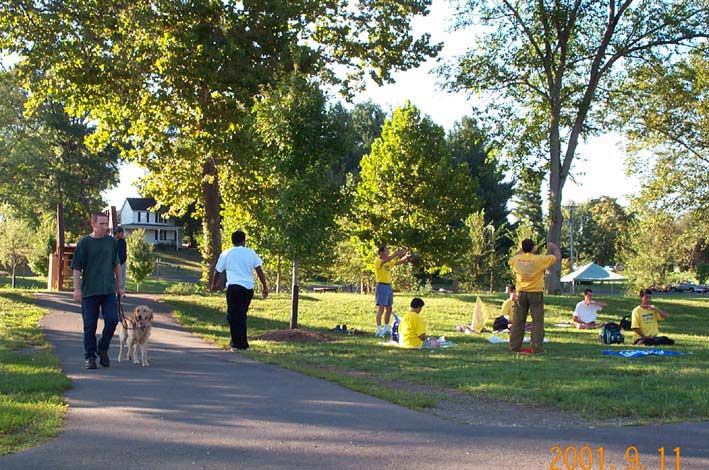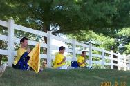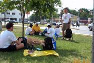 | 借路旁午餐休息时间,学员互相交流体会 | 在Manassas镇参加当地学员一周一次的集体炼功 | Manassas镇一家报刊对学员进行采访 |