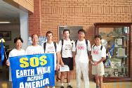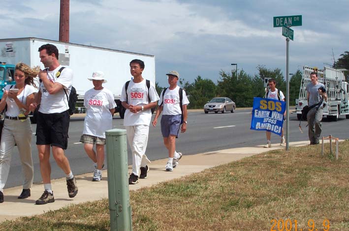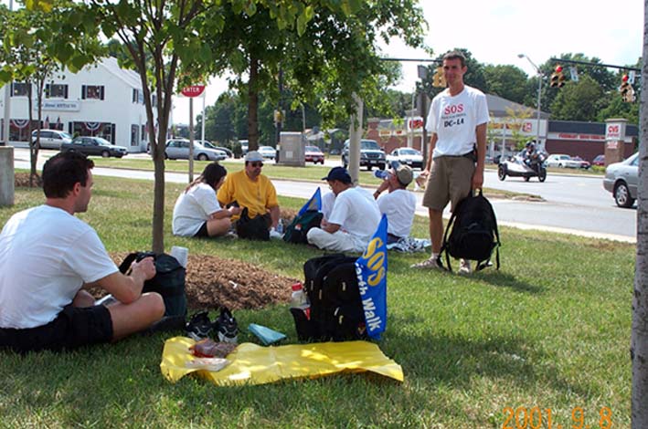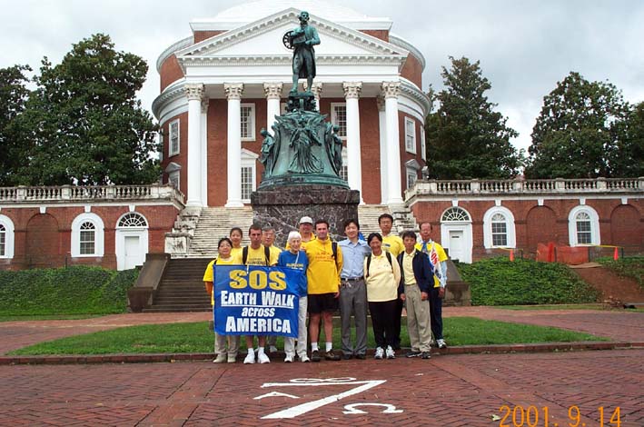 | 学员在前往Charlottesville市的路上发正念,铲除破坏大法的一切邪恶 | 学员步行到Charlottesville市,和当地学员一起在市内的Virginia大学洪法。市长特意给SOS步行者写信,表示对法轮功的支持 |