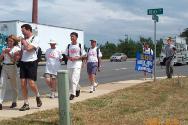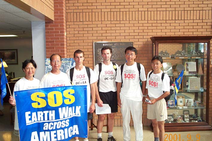 | 学员在Manassas镇政府大厅合影 | Manassas镇另一家每日报刊的两名记者陪同我们步行至少近一小时,并对每位步行者进行了深入采访, 对步行者的决心表示佩服 |