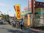 然后大家来到中国驻福冈领事馆。到了门口,刚刚向守卫的日本警察说明来意,里边的工作人员见状,赶快跑出来把外边的大铁栅栏门锁住,将门卫和大家都隔在外边,象是怕得要命。当时未到休息时间,大家祥和地表示只是希望递交一封请愿信而已。警察们对领事馆的如此举措也表示不解。大家只好向门卫谈了情况,将请愿信投进了大使馆的信箱。然后大家发正念铲除邪恶,追上行进中的队伍,一同继续前行。