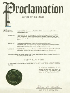 因此,我,德鲁.马丁,凡尔市市长现在宣布2001年9月10-16日为凡尔市“法轮大法周”