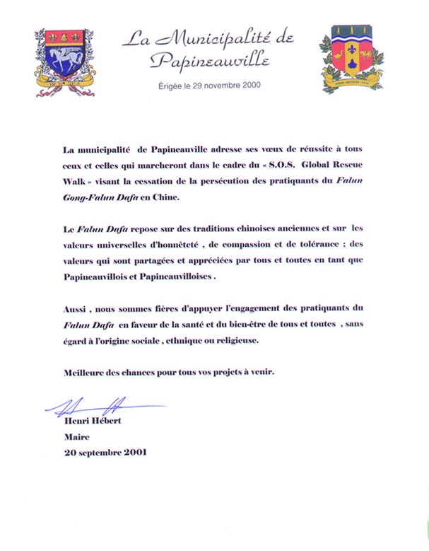 加拿大魁北克省帕皮纽维尔(Papineauville)市市政府向所有进行“全球SOS紧急救援步行”的、向为制止中国迫害法轮功修炼者而参与步行的女士们和男士们表示祝愿,祝愿步行成功。法轮大法是建立在中国久远的传统和包罗万象的真善忍价值上;这些价值被作为帕皮纽维尔(Papineauville)市所有的男女市民所分享和珍惜。