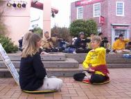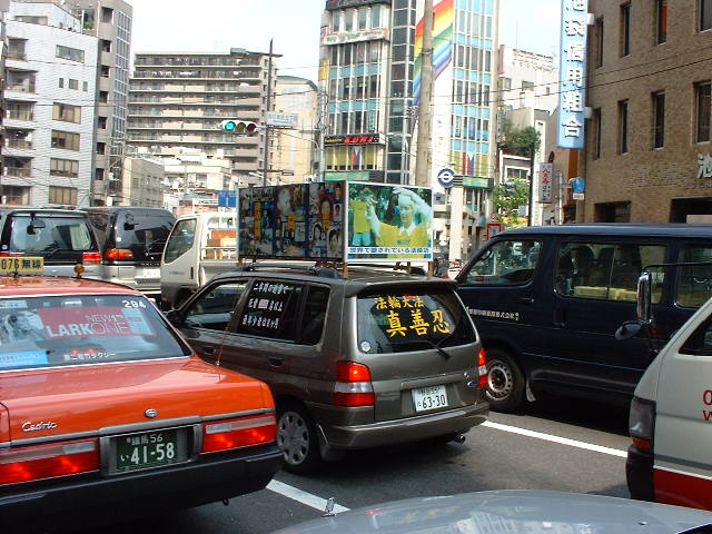 这一天和游行那天一样,是德国很少见的大晴天。街上的行人格外地多。由于这个广场处于交通要道旁边,又在中国节广场附近,常有满载中国人的大轿车从我们面前驶过。红灯时他们就停在我们炼功场地的前面。车里的每个人都在读横幅上的“法轮大法”和“真善忍”三个字。