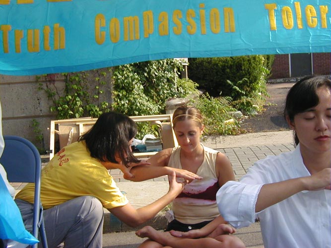 不少人迫不及待,马上加入炼功行列,亲身体验。一位教瑜伽的白人女士一口气学了五套功法,连连称赞:太好了,太好了!不少人询问哪里能学功,哪里有讲座。还有的人问:参加讲座的费用是多少,当听到学员说法轮大法所有教功和讲座均免费时,十分惊讶,学员指指“真善忍”三个字,他们点头赞许。当学员介绍大法能给人带来内心的平静时,人们无不说:我们太需要这个了。