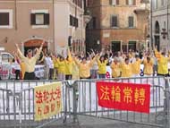 晚上,弟子们在著名的西班牙广场的台阶上,举行了烛光守夜,悼念在中国被迫害致死的283位中国学员,用这样的形式唤醒世人的良知。庄严的普度济世音乐再次奏响在罗马的夜空中。