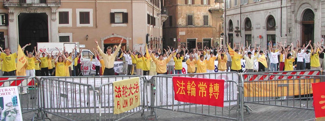 早上9:00,下过一夜暴雨的罗马,天空非常晴朗,气温温和。200多名大法弟子来到议会广场,随着炼功音乐连续演示5套功法,并多次齐发正念,祥和的气氛和优美的动作,引起了在议会门前执勤的警察,和过路的行人和来上班的议员们的好奇和关注。由于在纽约发生的恐怖主义事件,许多媒体都曾表示对我们的活动没有兴趣,不准备来采访。大约十点钟左右,我们却看到各主要电视台,新闻社和报纸记者都纷纷到场,对学员的炼功场面进行长时间拍摄,并对在场学员进行采访。