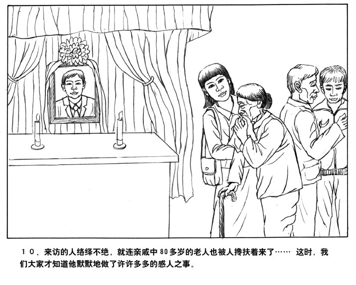 10、来访的人络绎不绝,就连亲戚中80多岁的老人也被人搀扶着来了……,这时,我们才知道他默默地做了许许多多的感人之事。