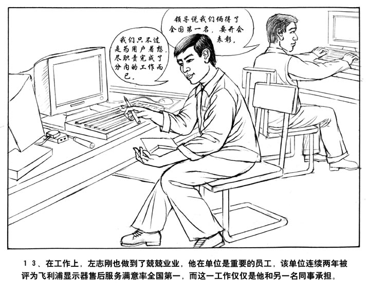 13、在工作上,左志刚也做到了兢兢业业,他在单位是最重要的员工,该单位连续两年被评为飞利浦显示器售后服务满意率全国第一,而这一工作仅仅是他和另一名同事承担。
