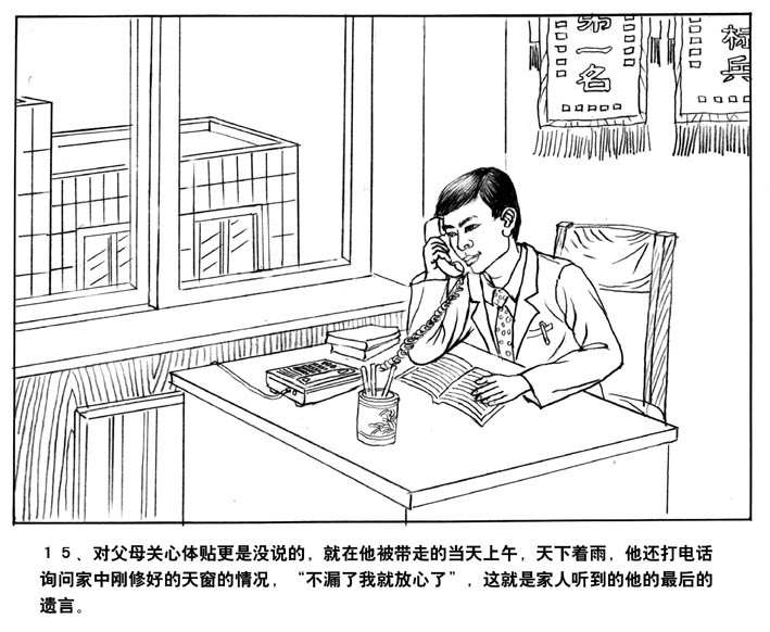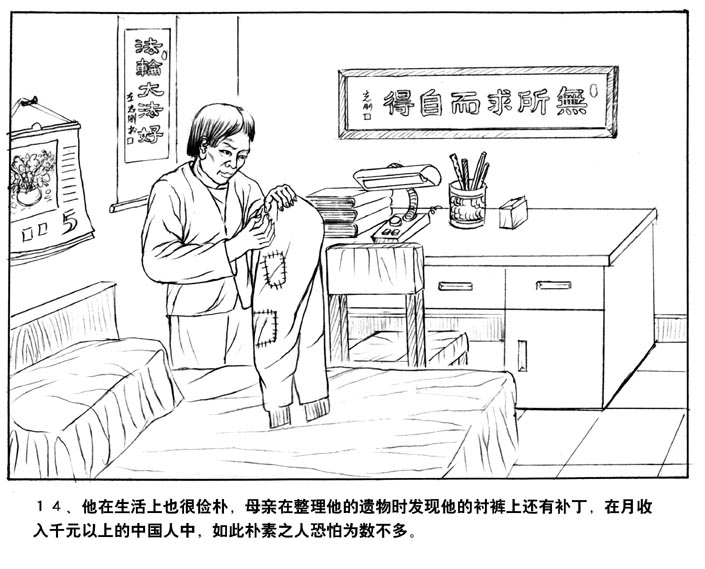 14、他在生活上也很简朴,母亲在整理他的遗物时发现他的衬裤上还有补丁,在月收入千元以上的中国人中,如此朴素之人恐怕不多。